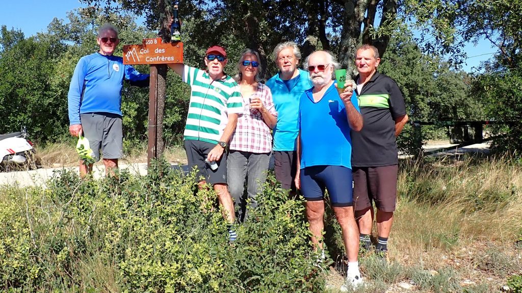 Au départ, l’idée c’était de faire un barbecue ! Mais… bon, là-haut, au « col des Confrères », c’est la garrigue et ça grouille de chênes-verts et de genévriers cade. Et ces trucs-là, vue de loin, ça semble innocent comme l’agneau qui vient de naître, mais que passe dans le coin une cigarette mal éteinte et tout le monde s’enflamme tel un public de midinettes lors d’un concert de Christophe Mahé. Alors, nous avions tenté de nous renseigner sur les possibles interdictions de faire du feu et sur les risques de nous faire embarquer par la maréchaussée, mais sans recevoir de véritables réponses claires. Alors, téméraires mais pas irresponsables, nous avions décidé de demeurer dans le menu froid. Pas de feu, ok, mais pas question de rester dans le traditionnel pour fêter un événement majeur de la vie confrériale : le changement du panneau du col. L’un des gestionnaires de l’association avait même fait l’effort de modifier un programme pourtant chargé pour être présent au jour dit. Alors… nouvelle idée : une tarterie. Ceux qui le désiraient et qui en étaient capables pouvaient composer et apporter une tarte salée ou sucrée. Aucune obligation simplement au « feeling » pour ceux qui le sentaient. Avec simplement l’obligation d’avertir sur le type de tarte choisi, afin de ne pas se taper que des oignons ou des endives ou que des pommes ou du citron. A la veille du jour dit, nous comptions cinq tartes, deux salées et trois sucrées. L’affaire semblait équilibrée pour la dizaine de cyclos présents. Hélas, il n’est jamais bon de sous-estimer la bonne volonté des confrères. Et au départ de la rando, le samedi 11 octobre, ben des tartes, des beignets et des madeleines aussi, un minimum dissidentes mais qu’importe, il y en avait plein le coffre de la voiture de Chantal, censée transporter le « frichti » jusqu’au col. Ainsi, après la grimpée facile du col de Fambetou et la trentaine de kilomètres de belle ballade sous le soleil, nous étions à 13 h 30 au lieu désormais territorialement remarquable dans l’Histoire de la Confrérie. Le temps qu’Antoine ne casse le poteau supportant le panneau (qui ne demandait que cela, il est vrai), qu’il découvre la meilleure façon de quand même le rendre visible dans l’attente d’une vraie restauration, celui des méditations et des photographies et nous nous mîmes à table… par terre.